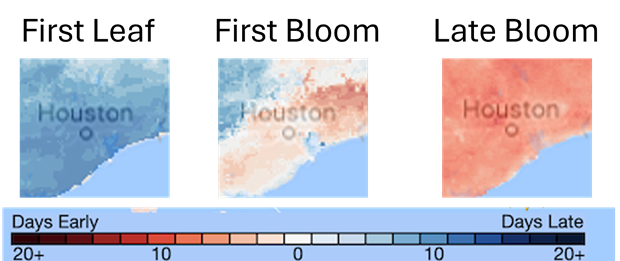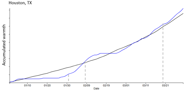 Temperatures were cooler than average throughout the month of January in Houston, TX. The Leaf Index was reached on Jan 31, nine days later than is typical for this location. However, a pulse of warmth bumped heat accumulation forward, and the Bloom Index was reached one day earlier than average in Houston, in early February. Warmth continued to accumulate for the next several weeks, ultimately resulting in in the Late Bloom Index being reached nearly a week early in late March.