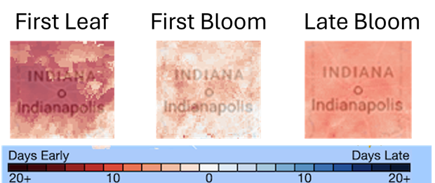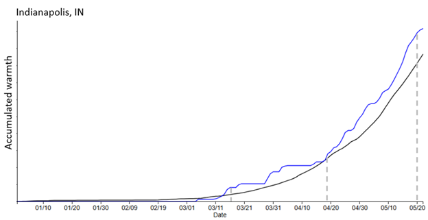 The story played out a bit differently further north, in Indianapolis, IN. The Leaf Index was reached over a week earlier than average, on Mar 15 this year. Heat accumulation stalled out in early April, when a cold spell parked over the region; the Bloom Index was reached only three days early, on Apr 19. However, warmer than average temperatures throughout late April and all of May led the Late Bloom Index to be reached eight days early, on May 20.