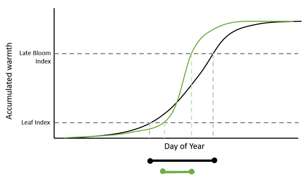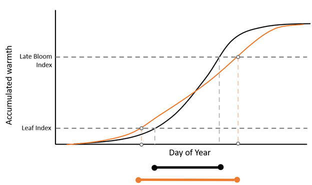 The plot above depicts a scenario where warmth was accumulated more quickly than average early in the year. The first index is reached earlier than average, shown by the orange line crossing the dashed line representing the Leaf Index earlier in the year. However, the Late Bloom Index is reached later than usual in this scenario as a consequence of a cool period and a slow-down in the rate of heat accumulation, shown as the orange line crossing the upper dashed line later in the year. The orange “barbell” below the plot indicates that more time elapsed between the two indices in this particular year than typically occurs.